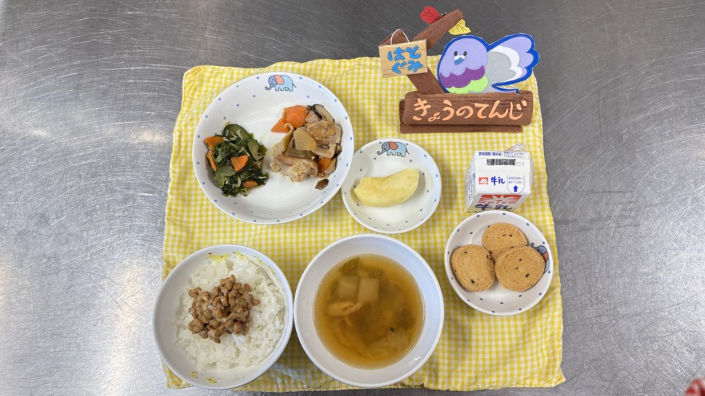 ◎給食 主食:納豆ご飯 汁物:味噌汁(白菜・油揚げ) 主菜:鶏と大根の煮物 副菜:野菜の磯和え 果物:りんご
