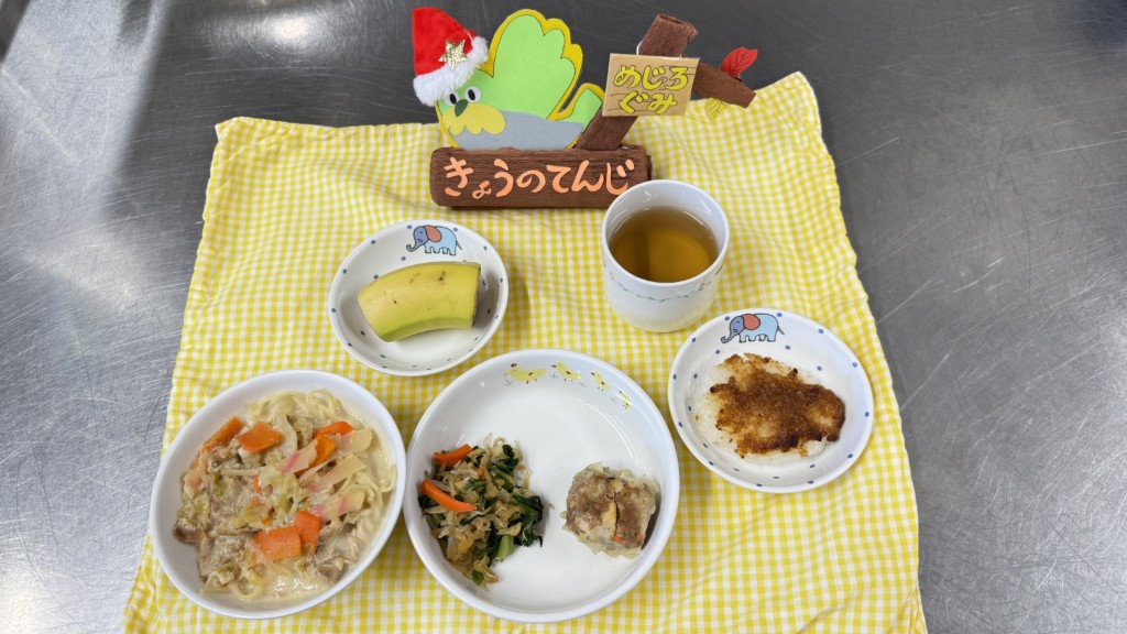◎給食 主食:ちゃんぽん 主菜:焼売 副菜:小松菜とじゃこの和え物 果物:バナナ