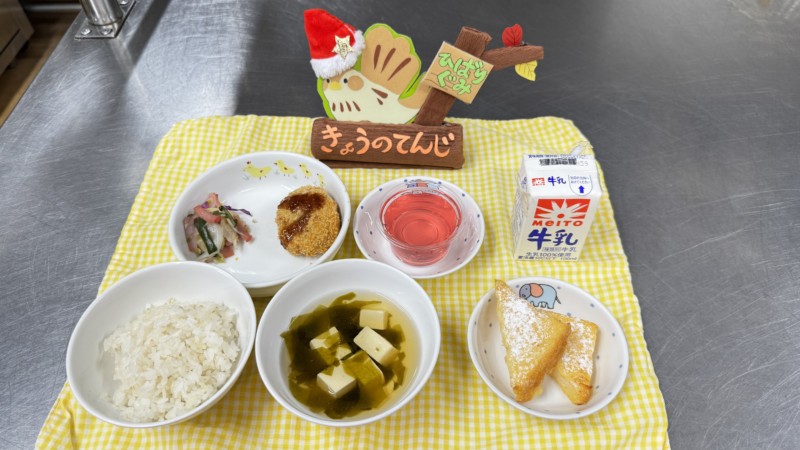 ◎給食 主 食:もち麦ご飯 汁 物:すまし汁(若布・豆腐) 主 菜:里芋コロッケ 副 菜:キャベツサラダ デザート:ゼリー(イチゴ味)