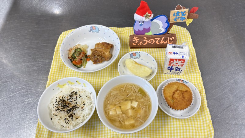 ◎給食 主食:ふりかけご飯 汁物:味噌汁(豆腐・葱・えのきだけ) 主菜:名古屋チキン 副菜:野菜の塩昆布和え 果物:りんご