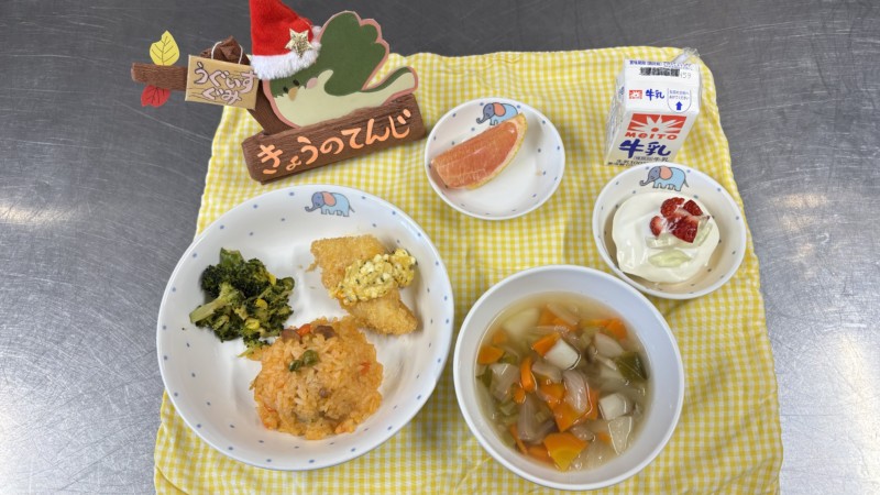 🍎スープはかぶも入って野菜たっぷり。フライはタルタルソースにしてみました。今月のケーキはいちご🍓でおめかし。クリスマスっぽいかな?
