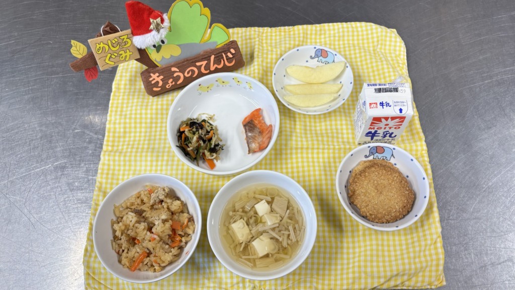 ◎給食 主食:炊き込みご飯 汁物:すまし汁(ねぎ・えのき・豆腐) 主菜:焼魚(鮭) 副菜:野菜の海苔和え 果物:りんご