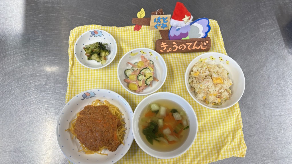 ◎給食 主食:スパゲティーミートソース 汁物:チキンスープ 副菜:ブロッコリーソテー 副菜:さつまのヨーグルトサラダ デザート:ゼリー(あおりんご)*
