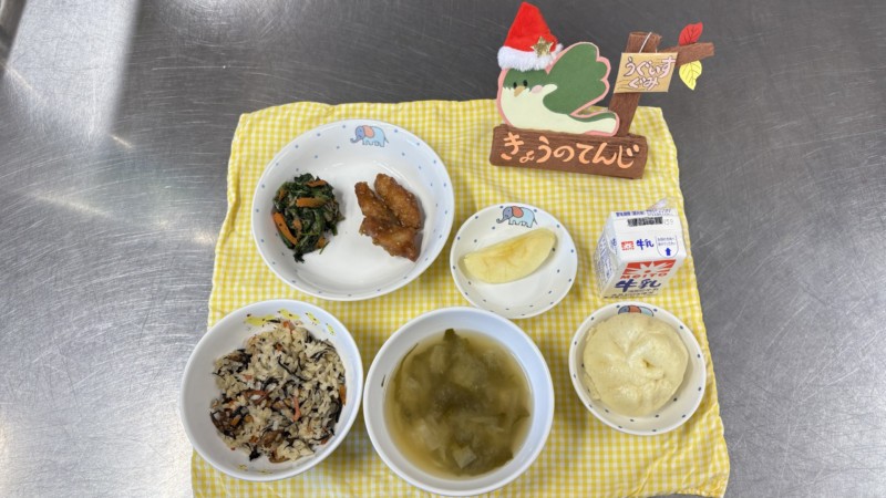 ◎給食 主食:ひじきご飯 汁物:味噌汁(さつま芋・玉ねぎ・若布) 主菜:豚肉のかりん揚げ 副菜:ほうれん草の胡麻和え 果物:りんご