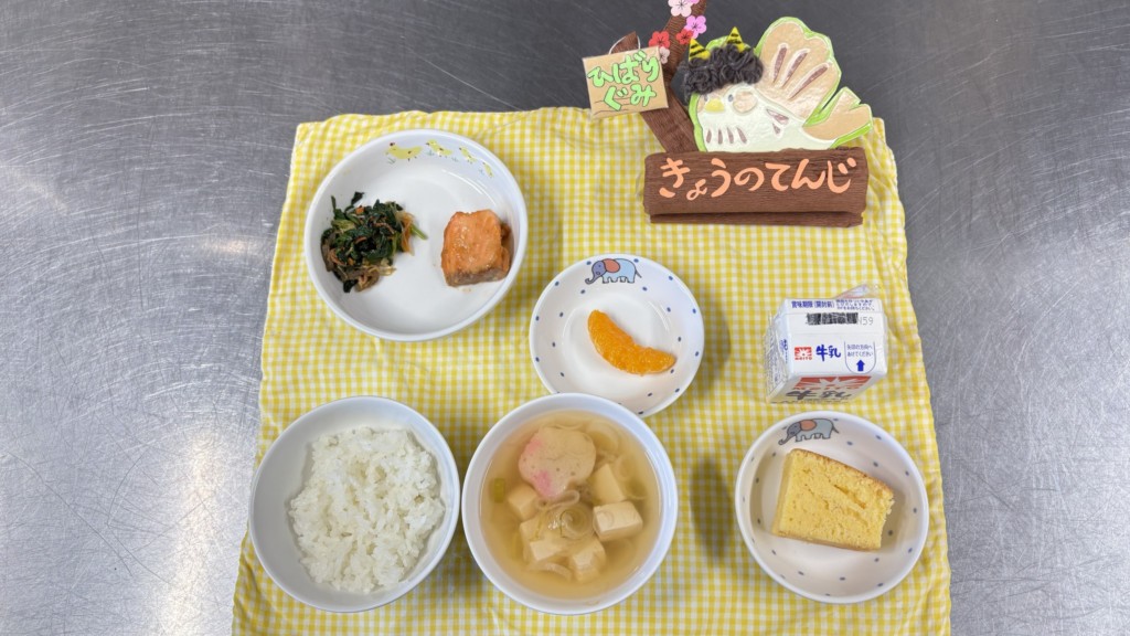 ◎給食 主食:ごはん 汁物:すまし汁(葱・花麩・豆腐) 主菜:鮭の味噌バター煮 副菜:糸こんにゃくのナムル 果物:ぽんかん