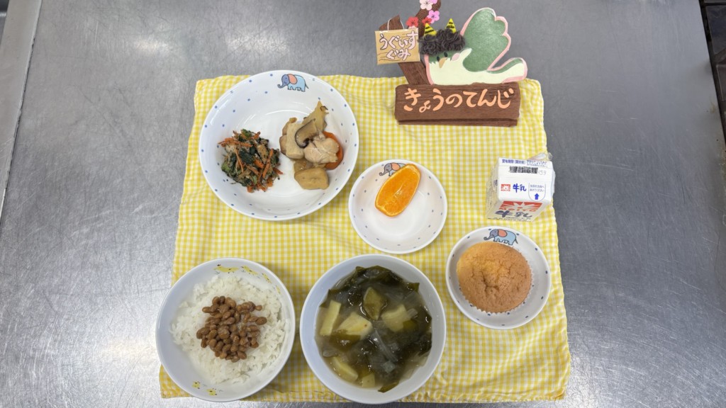 ◎給食 主食:納豆ご飯 汁物:味噌汁(さつま芋・玉葱・若布) 主菜:鶏と大根の煮物 副菜:五目和え 果物:ぽんかん