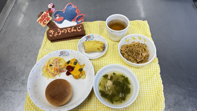 ◎給食 主食:ぎゅうにゅうパン 汁物:チキンとえのきのスープ 主菜:スパニッシュオムレツ 副菜:スパゲティーサラダ 果物:バナナ