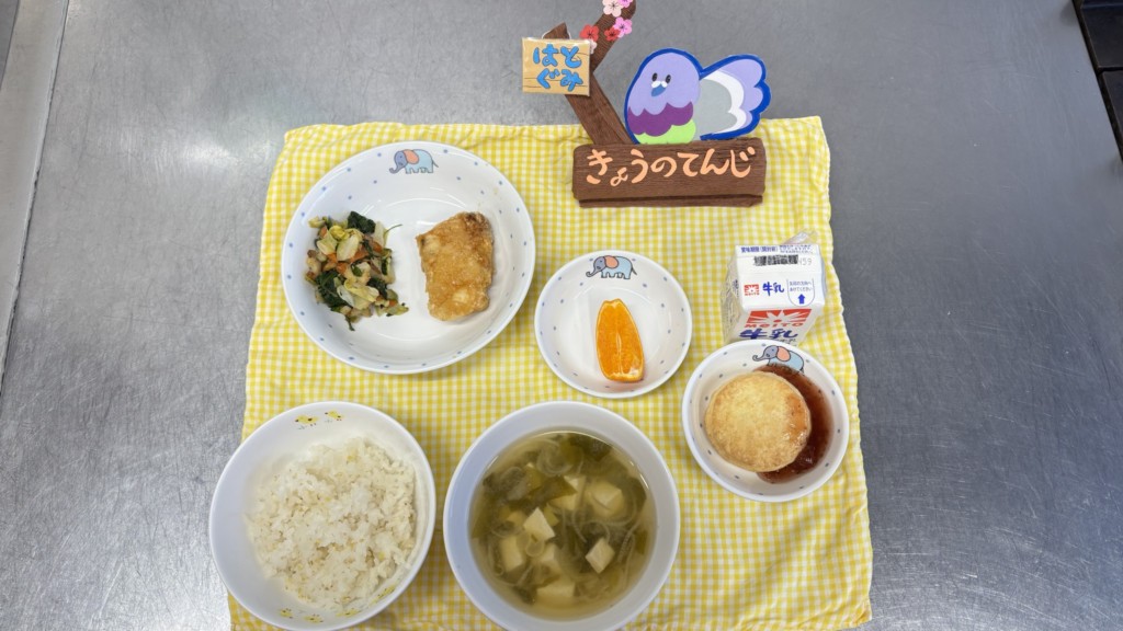 ◎給食 主食:五穀米ご飯 汁物:味噌汁(豆腐・葱・若布) 主菜:カジキマグロのから揚げ 副菜:ちくわのごま和え 果物:ぽんかん