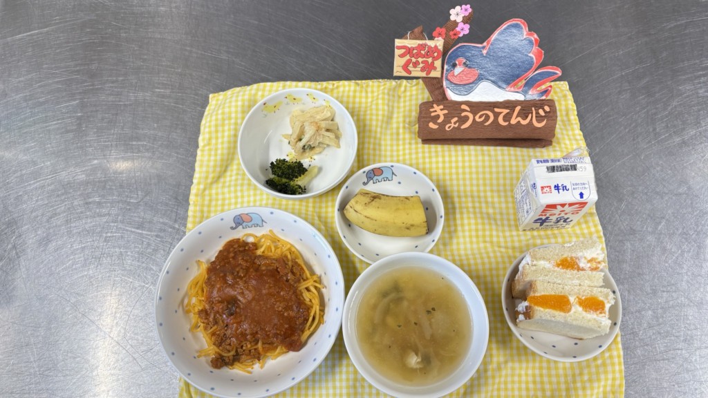 ◎給食 主食:インディアンスパゲティ 汁物:キャベツスープ 副菜:大根サラダ 副菜:ブロッコリーのソテー 果物:バナナ