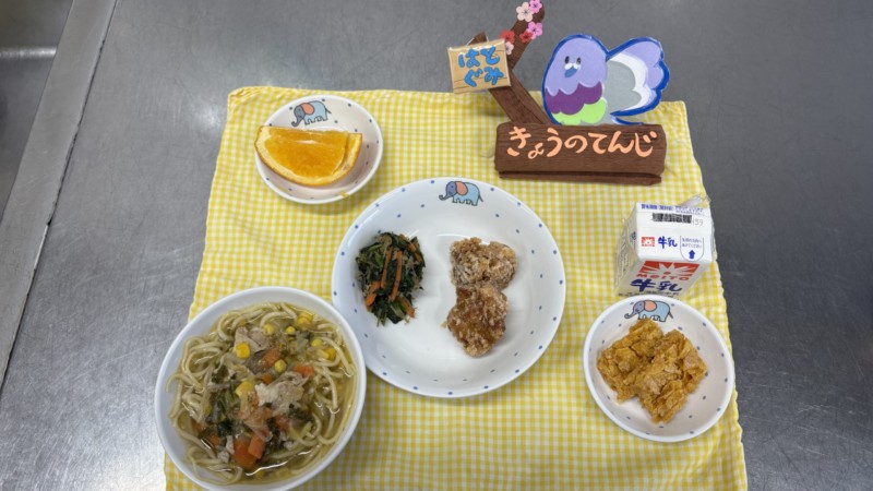 ◎給食 主食:タンメン 主菜:鶏のから揚げ 副菜:ほうれん草の胡麻和え 果物:きよみ(変更になっています)