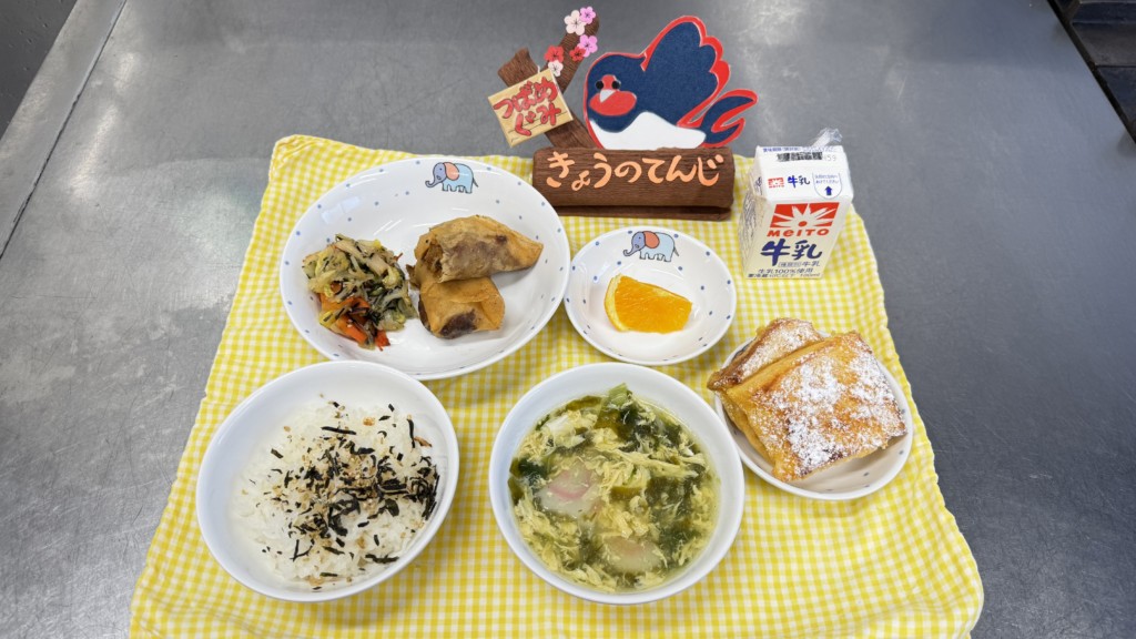 ◎給食 主食:ふりかけご飯 汁物:かきたま中華風スープ 主菜:春巻き 副菜:白菜のりサラダ 果物:きよみ(献立変更となります)