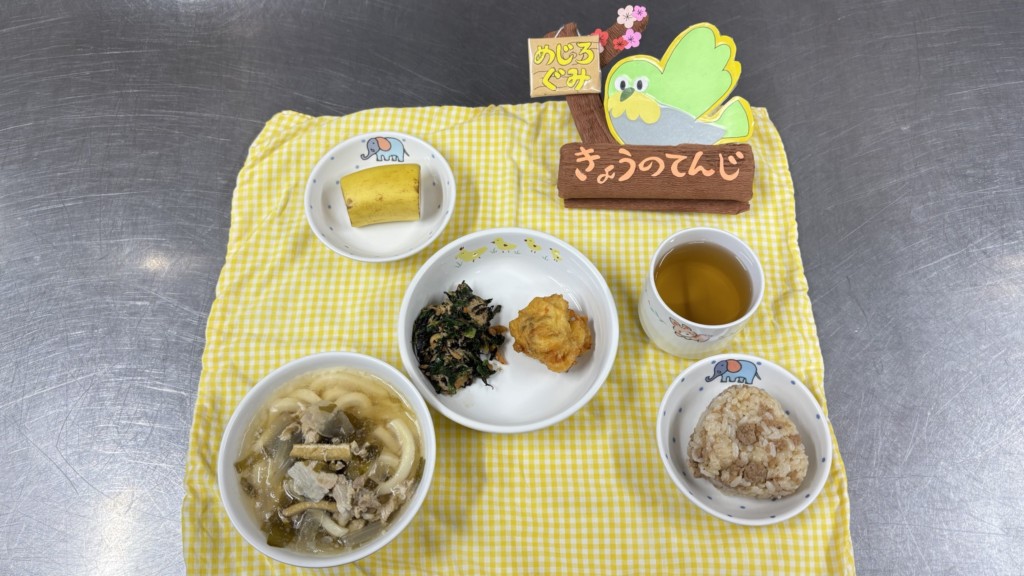 ◎給食 主食:磯うどん 主菜:豆腐のまさご揚げ 副菜:ほうれん草のひじきサラダ 果物:バナナ