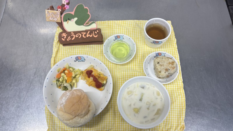◎給食 主 食:白パン 汁 物:さつま芋のミルクスープ 主 菜:スパニッシュオムレツ 副 菜:野菜とチーズのサラダ デザート:ゼリー