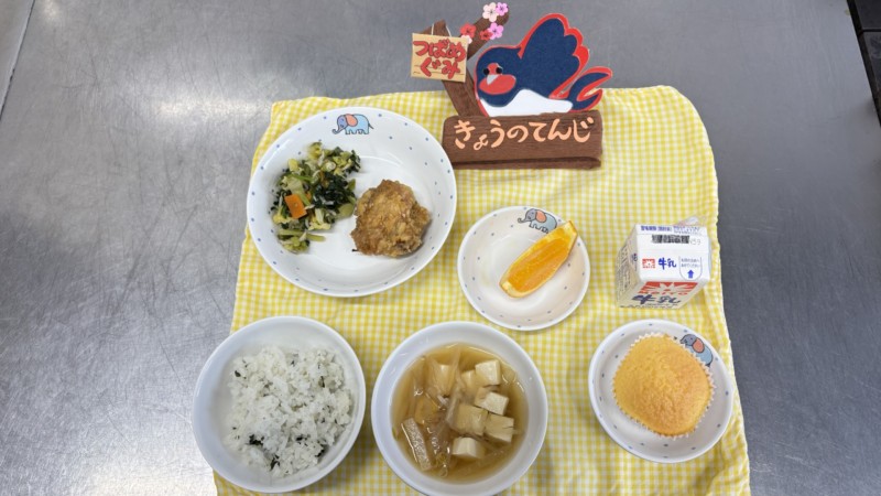 ◎給食 主食:わかめごはん 汁物:味噌汁(大根・もやし・豆腐) 主菜:名古屋チキン 副菜:野菜のじゃこ和え 果物:清見オレンジ