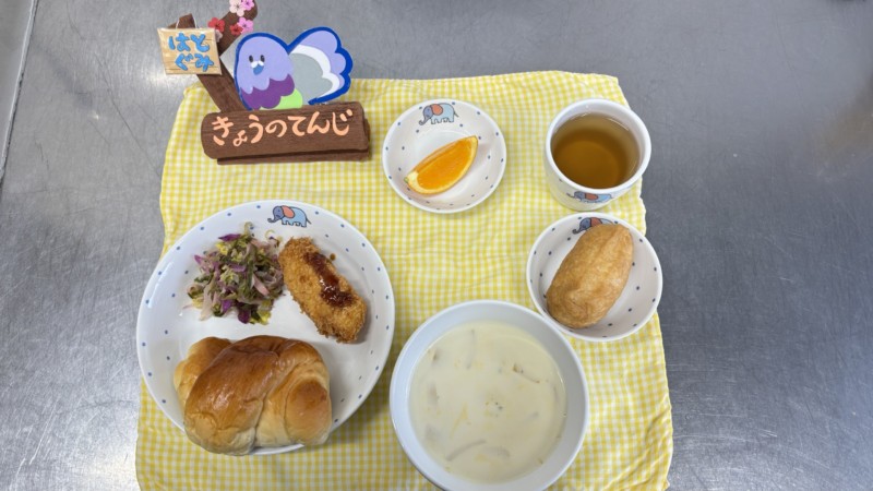 ◎給食 主食:ロールパン 汁物:コーンポタージュ 主菜:白身魚のフライ 副菜:キャベツサラダ 果物:清見オレンジ
