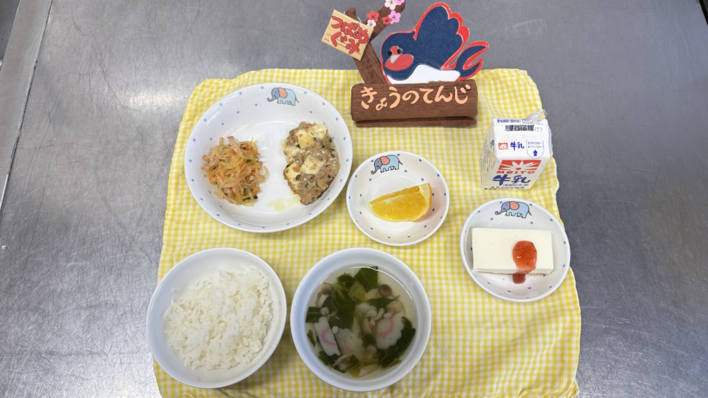 ◎給食 主食:ご飯 汁物:青梗菜となるとのスープ 主菜:マーボー豆腐 副菜:春雨サラダ 果物:甘夏