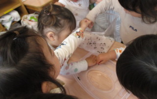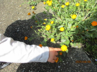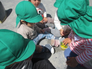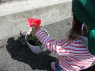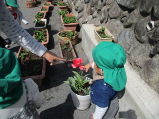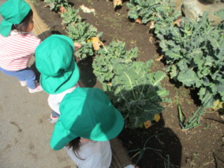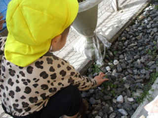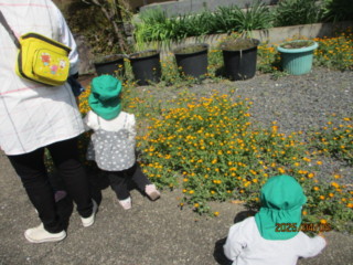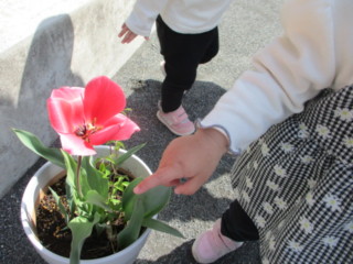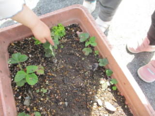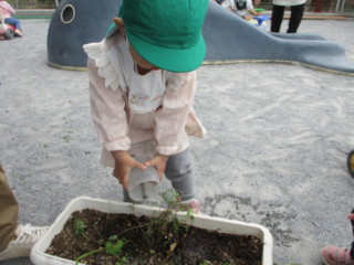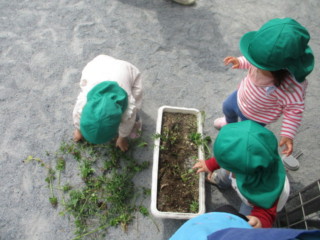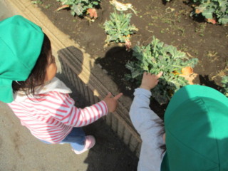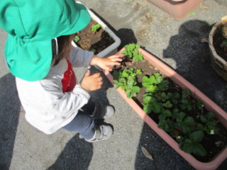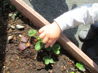 1歳児のお友達は保育園の畑のや花壇の植物に興味を示し「ツンツン」とかわいい声と一緒に植物に触れることを楽しんでいます。