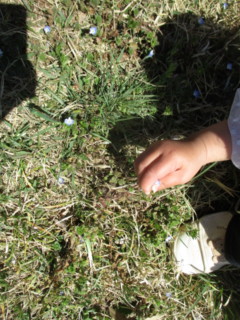 2歳児さんはお部屋の前の野草も葉っぱの形が違うことに気が付き「長ーい!」「大き~い」と違いの発見を楽しんでいます。