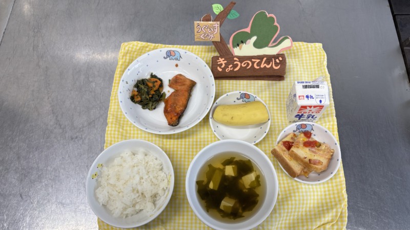 ◎給食 主食:ご飯 汁物:すまし汁(若布・豆腐) 主菜:鮭の味噌バター煮 副菜:野菜のりサラダ 果物:バナナ