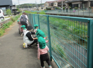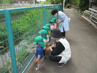 子ども達の声が届いたのか、一匹また一匹と草葉の陰から泳ぎ出てきます。