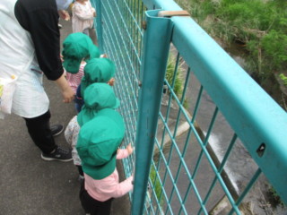 真下に落ちたはずの子供たちのパンが川の中腹にいる鯉までたどり着いている!!!