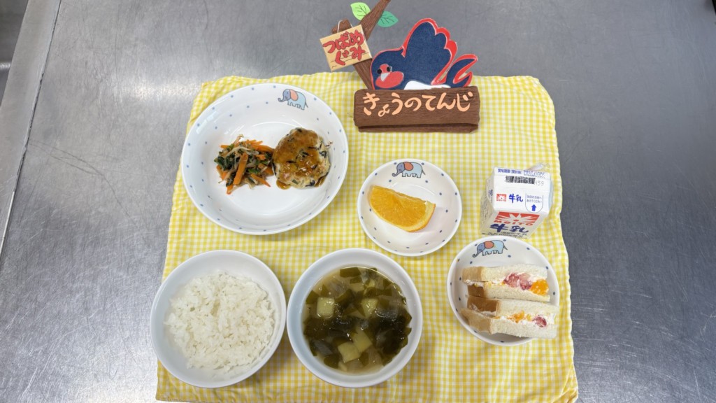 ◎給食 主食:ご飯 汁物:味噌汁(さつま芋・玉ねぎ・若布) 主菜:和風つくね焼 副菜:ほうれん草と人参のお浸し 果物:甘夏