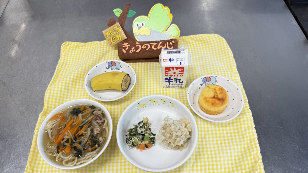 ◎給食 主食:もやしそば 主菜:珍珠丸子 副菜:小松菜の胡麻マヨネーズ和え 果物:バナナ