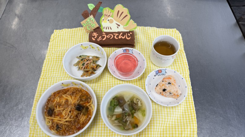 ◎給食 主食:ミートナススパゲティ 汁物:かぶのコンソメスープ 副菜:ごぼうサラダ デザート:ゼリー(いちご)