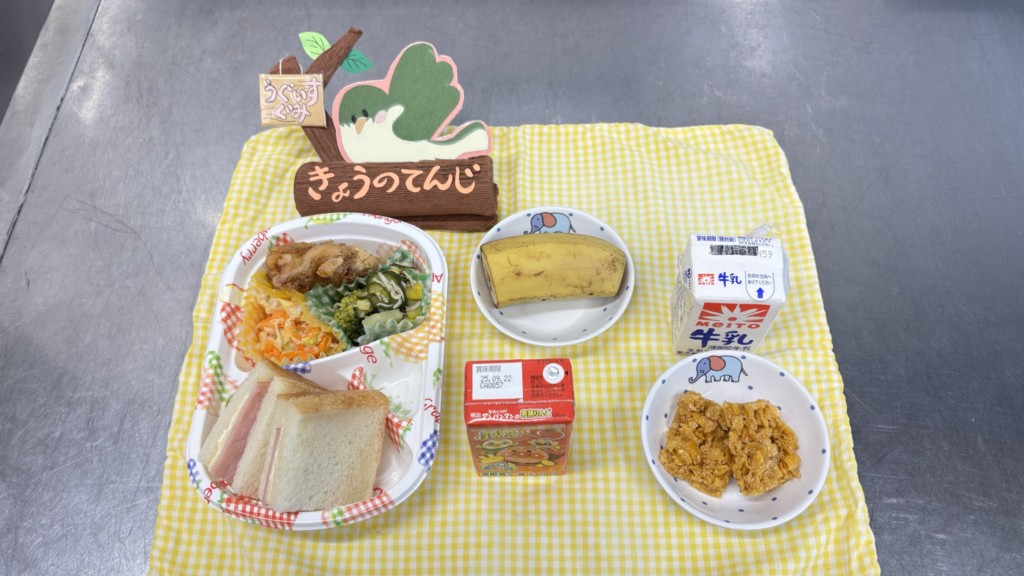 🌱今日は歩き遠足でした。給食も遠足気分でお弁当🍱幼児クラスは2階の好きな場所の敷物のうえで美味しそうに食べていました🥰