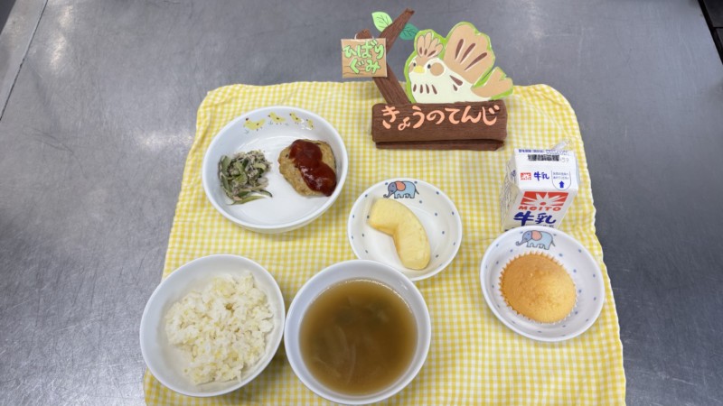 🌱豆腐いりで柔らかい食感のハンバーグが出来上がりました。きびいりのご飯に苦戦する子もいましたが、みんなよく食べていました😄