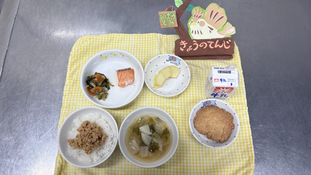 ◎給食 主食:納豆ご飯 汁物:味噌汁(かぶ・玉ねぎ) 主菜:焼魚(鮭) 副菜:野菜の塩昆布和え 果物:りんご