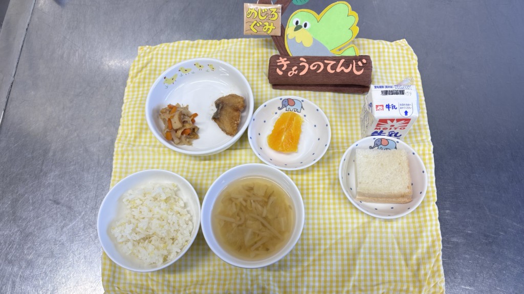 ◎給食 主食:きびご飯 汁物:味噌汁(きゃべつ・もやし) 主菜:すずきの甘酢揚げ 副菜:切干大根の煮物 果物:オレンジ