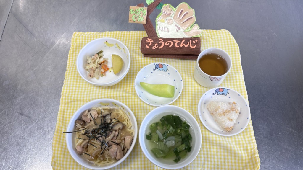 ◎給食 主食:きのことチキンのパスタ 汁物:野菜スープ(青梗菜・スナップエンドウ) 副菜:さつまいもの甘煮 副菜:梅ドレッシングサラダ 果物:メロン