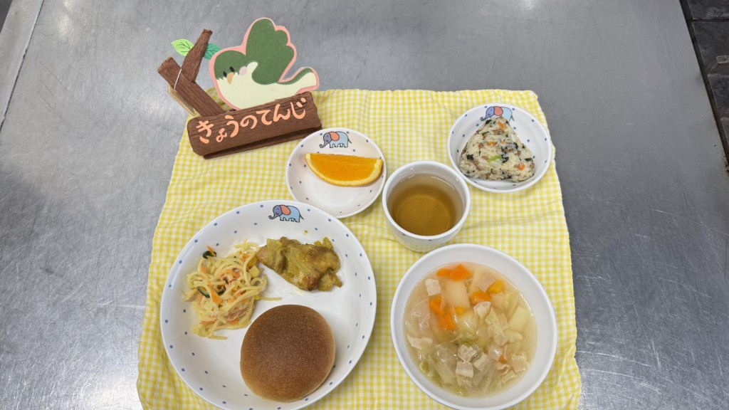 ◎給食 主食:牛乳パン 汁物:野菜とベーコンのスープ 主菜:タンドリーチキン 副菜:スパゲティサラダ 果物:オレンジ