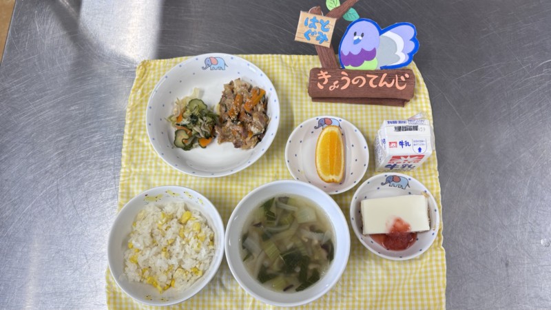 ◎給食 主食:とうもろこしご飯 汁物:春雨スープ 主菜:プルコギ 副菜:野菜のじゃこ和え 果物:オレンジ