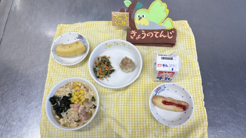 ◎給食 主食:かきたまわかめラーメン 主菜:焼売 副菜:野菜のナムル 果物:バナナ