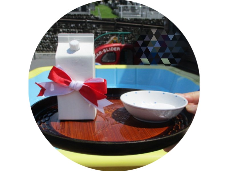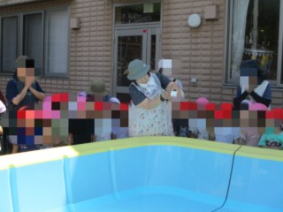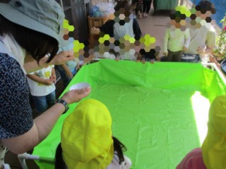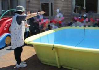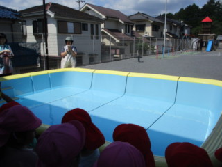 お酒とお塩でお清めをし、はと組さんがプールに入って遊びました🎵