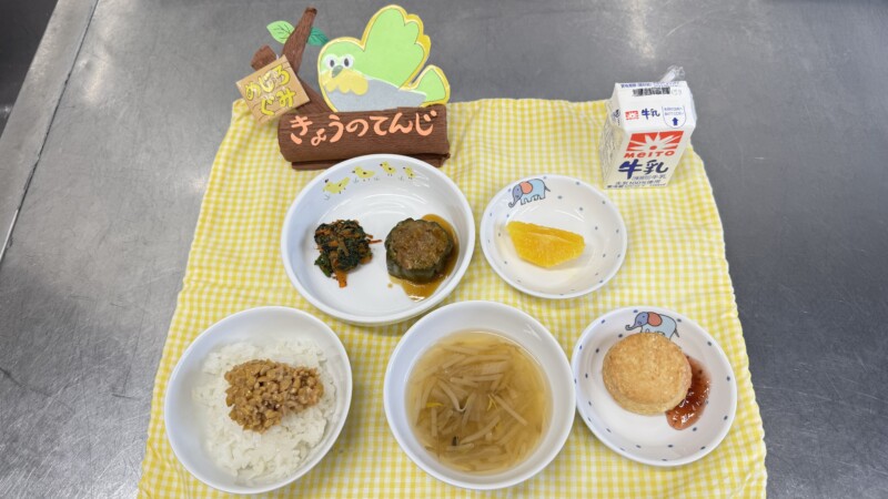 ◎給食 主食:納豆ご飯 汁物:味噌汁(だいこん・もやし) 主菜:ピーマンの肉詰め 副菜:ほうれん草と人参の胡麻和え 果物:オレンジ