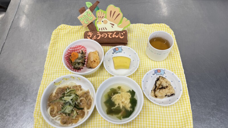 ◎給食 主食:ジャージャー麵 汁物:かきたまスープ 主菜:カジキマグロのから揚げ 副菜:チョレギサラダ 果物:バナナ