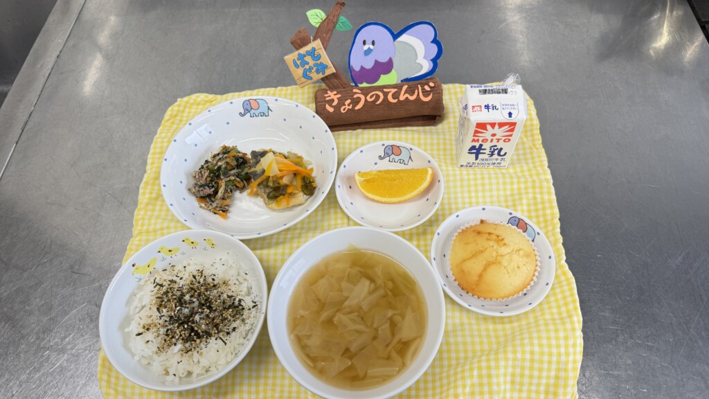 ◎給食 主食:ふりかけご飯 汁物:味噌汁(キャベツ・玉葱) 主菜:アジのマリネ(1・2歳児は鮭のマリネになります) 副菜:五目和え 果物:オレンジ