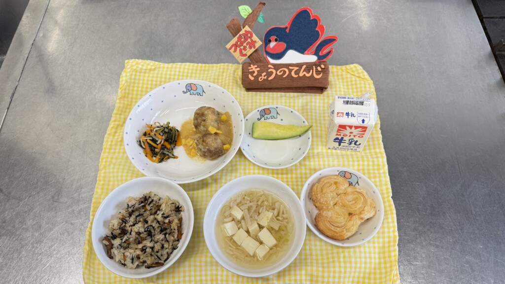 ◎給食 主食:ひじきごはん 汁物:味噌汁(ねぎ・えのき・豆腐) 主菜:肉団子の味噌煮 副菜:小松菜と人参のナムル 果物:メロン