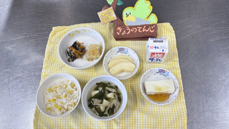 ◎給食 主食:とうもろこしご飯 汁物:モロヘイヤのスープ 主菜:魚のパン粉焼き 副菜:ひじきとツナの醤油和え 果物:りんご