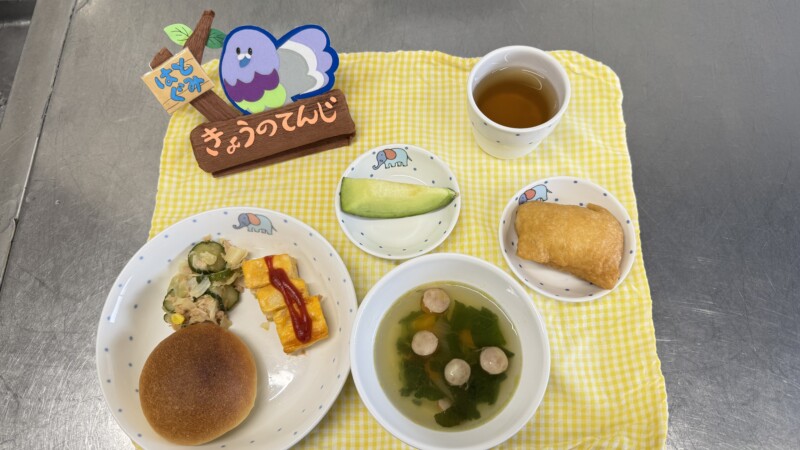 ◎給食 主食:牛乳パン 汁物:ウインナースープ 主菜:スパニッシュオムレツ 副菜:ツナサラダ 果物:メロン