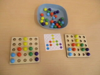 図と同じように色の付いた玉を指先やトングを使ってボードに乗せていきます。