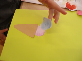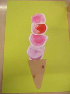 好きな色をスタンプしたら丸く切り取り、重ねて貼ったら「アイスクリームになったよ!」