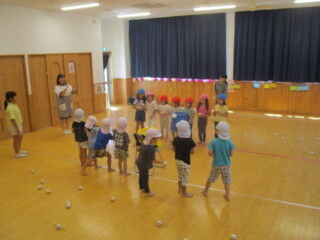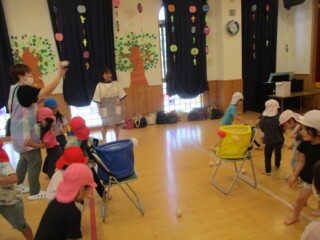 相手側の陣地にある自分のチームのカゴに向かって玉を投げ入れる「その場で玉入れ」