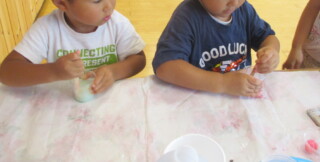 カップの中に好きな色を塗り、洗濯のりと塩、2:1の割合で混ぜるとだんだん塊になっていき・・・