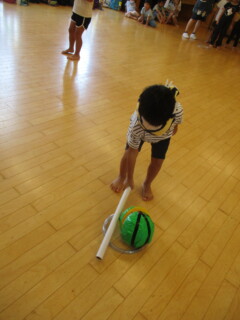 中にはどれが早く転がるか、競争を思いついて楽しむお友だちもいました。