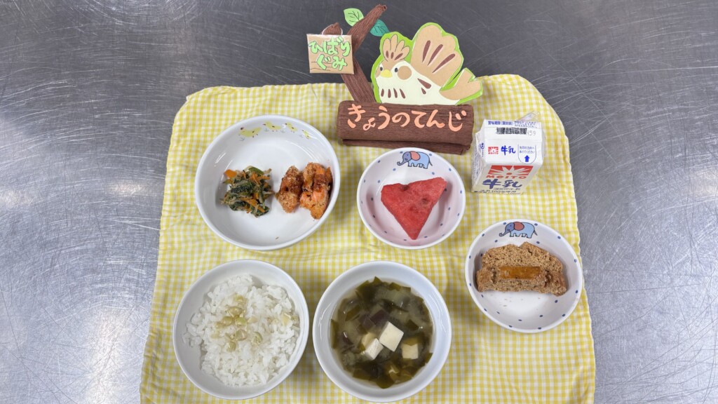 🍉旬の枝豆ご飯は子どもたちはちょっと苦手そう。ご飯の上にのせた枝豆は喜んで食べる子と苦戦する子に分かれたようです🫛