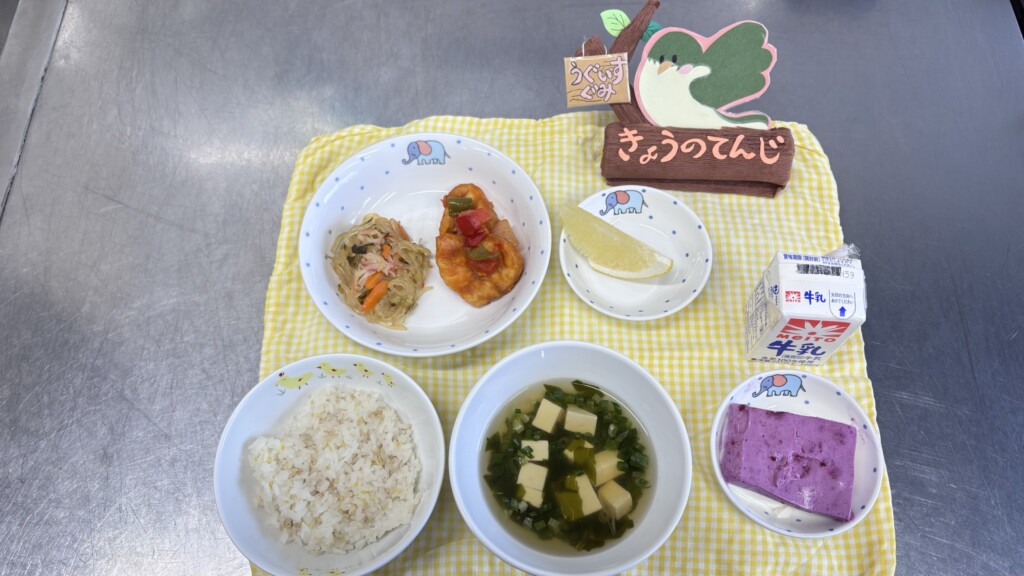 ◎給食 主食:五穀米ご飯 汁物:豆腐とわかめのスープ 主菜:鶏のケチャップ炒め 副菜:春雨サラダ 果物:グレープフルーツ